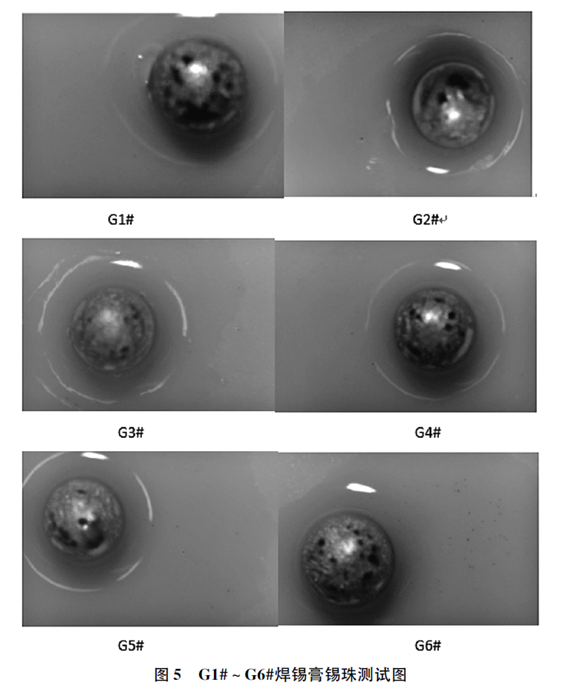 分析焊錫膏G1# ~ G6#所對應的焊錫粉F1# ~F6#,其氧含量依次升高,F1#最低50 mg /kg,F6#最高130 mg /kg。由表1、表2 得出焊錫粉氧含量對焊錫膏粘度穩定性有一定的影響,焊錫粉氧含量在80 ~ 120 mg /kg 時焊錫膏的穩定性較好。按照IPC - TM - 650 2. 4. 43 的試驗方法,以陶瓷片為載體對G1# ~ G6#進行了錫珠試驗,試驗結果如圖5所示。從圖5 看出G1#焊點周邊沒有小錫珠,G2#、G3#、G4#焊點周邊出現了小于5 個的小錫珠,G5#焊點周邊出現了大于10 個的小錫珠、G6 #焊點周邊出現無數錫珠。由此推斷當氧含量超過120 mg /kg 時,焊錫膏穩定性雖好,但是焊點周圍產生大量小錫珠。