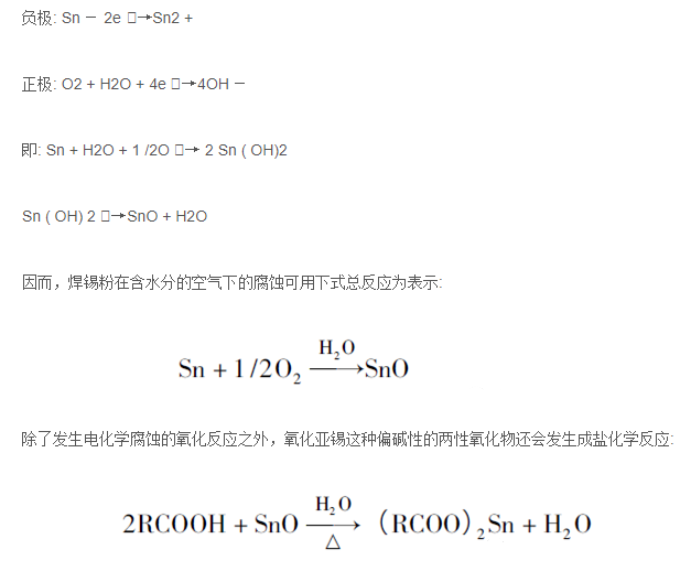 焊錫中除Sn 外還含有Ag、Cu ( 或其他元素)等相比較高電位的金屬,在有助焊劑介質的作用下,形成無數個以Sn 為負極、Ag /Cu 等為正極的原電池,這就會發生如下反應: